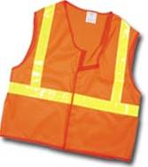 ANSI Class 2 Orange Mesh Vest · 3.4 oz durable, extra breathable 100% knit polyester mesh high visibility orange material · Matching high visibility trim all around · 2 high gloss lime/yellow reflective tape on front and back. · Full velcro front closure · Stock sizes: L-4XL, other sizes made to order |