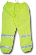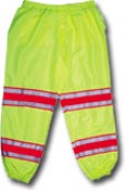 ANSI Lime Pants · 3.65 oz breathable, extra durable 100% knit polyester high visibility lime material · Matching high visibility trim all around · 4 high visibility orange fabric with double 1 silver reflective stripes · Side pocket slits for easy access to pant pockets · Drawstring waist · Velcro fly · One size fits most · When combined with 16334 ANSI Class 2 Deluxe DOT Vest, this ensemble meets Minnesota Class 3 DOT specs |