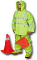 ANSI Class 3 Three Piece Rain Suit Heavy .35mm PVC/Polyester high visibility lime material. 3-piece rainsuit consists of jacket with detachable hood, and bib overall pants, 2 silver reflective tape on front and back. Reinforced seams for strength and durability. Entirely waterproof. Comfortable, oversize fit: Large - 2XL |